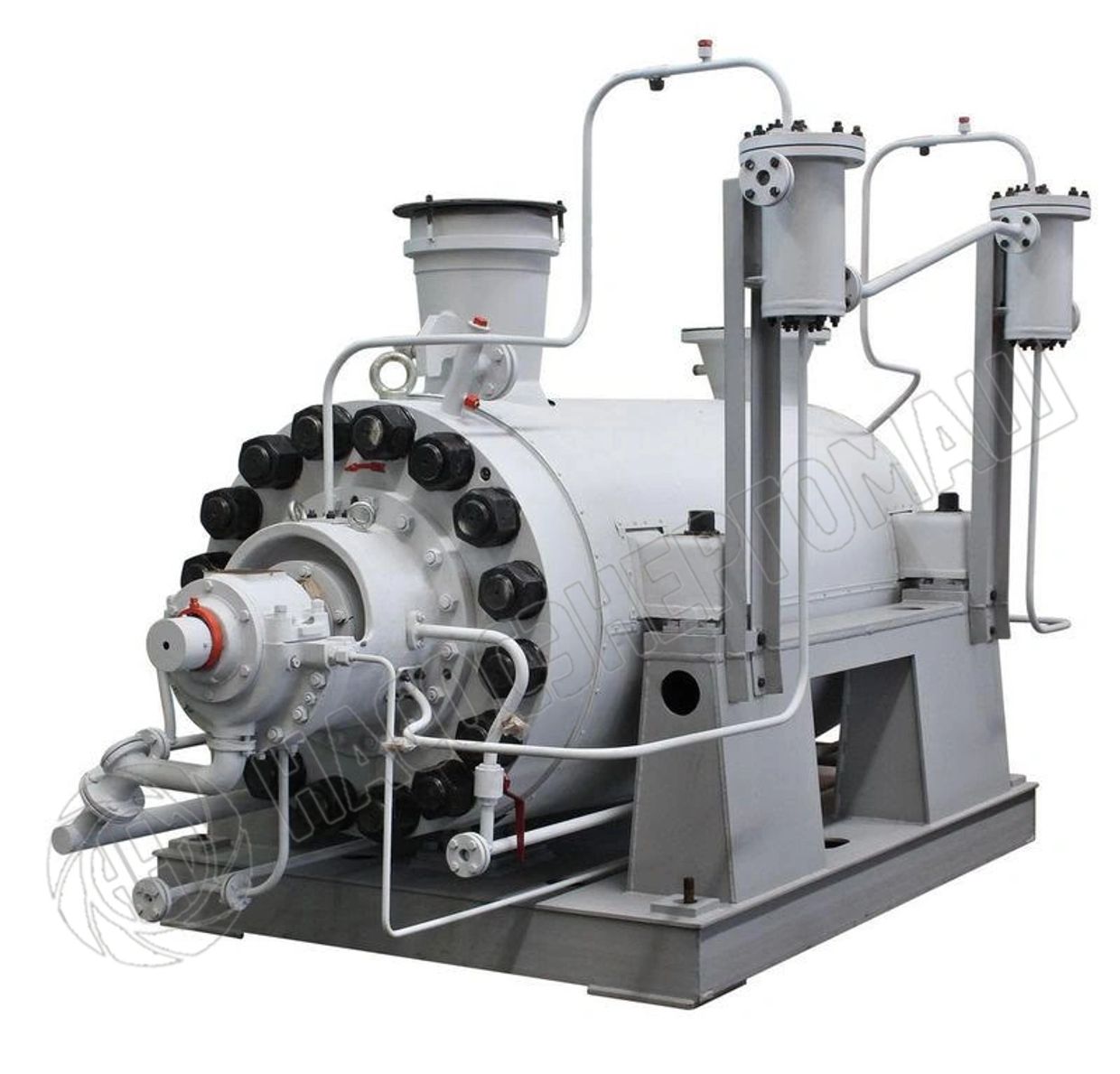 Motor driven horizontal multistage diffuser centrifugal pumps of segmental or barrel type with a withdrawable cartridge of ring-section type. Single flow impeller arrangement, with all the impellers facing the same way. May be operated both at the constant and variable speed of rotation. The pump rotor is carried by the oil-ring or pressure lubricated plain bearings. Shaft sealing: packed glands or mechanical seals.